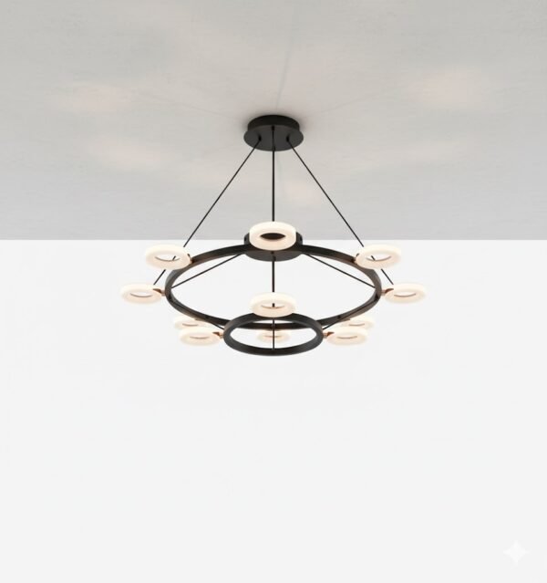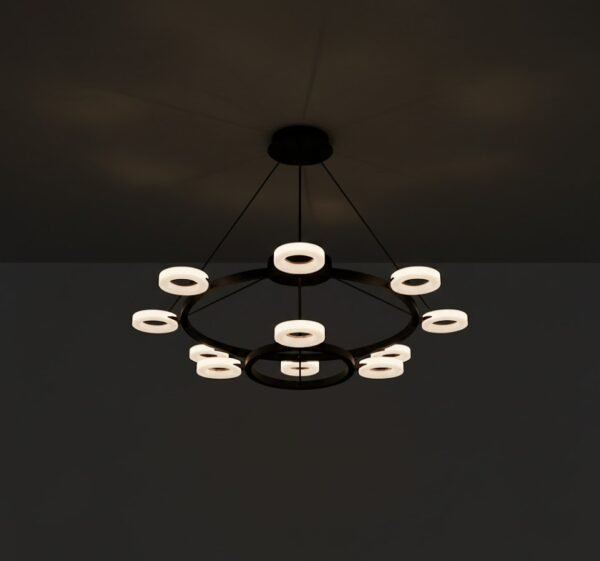 Featuring layered LED rings, this chandelier delivers a bold architectural presence with efficient illumination.