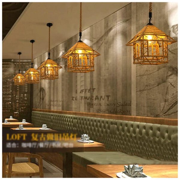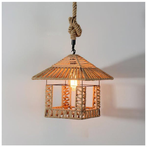 A creative house-shaped chandelier accented with rope details, blending rustic charm with playful design.